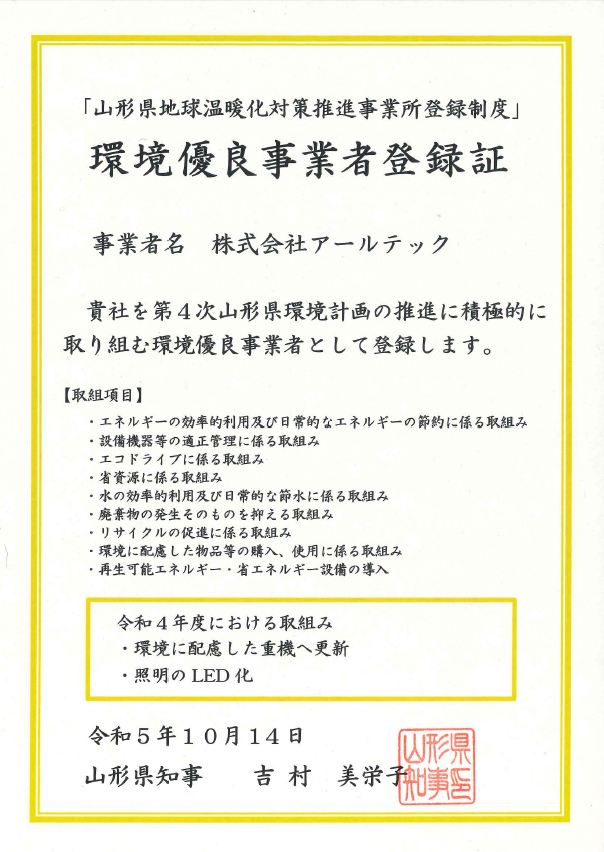 「山形県地球温暖化対策推進事業所登録制度」における環境優良事業者登録証をいただきました。