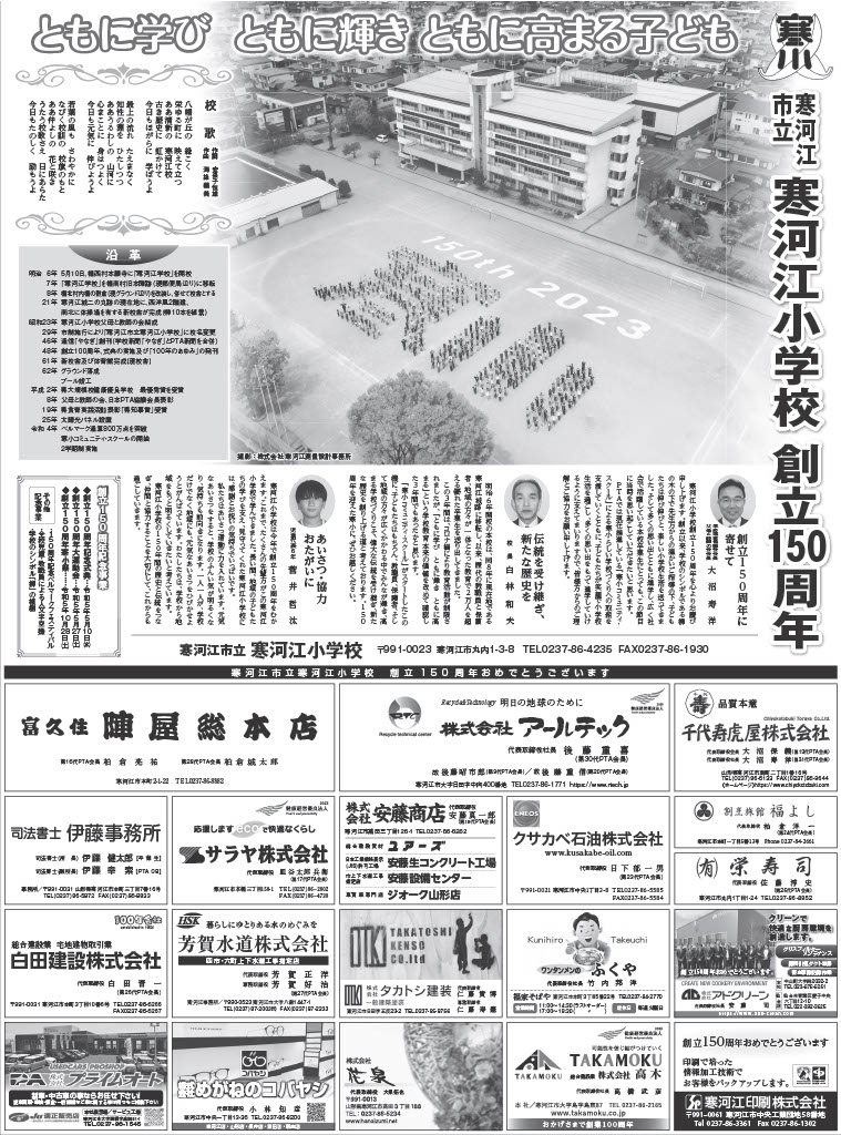 2023/05 2023年5月に寒河江市立寒河江小学校が創立150周年を迎え、協賛させていただきました。 弊社後藤社長も第30代PTA会長を務めてまいりました。 今後とも子どもたちのより良い未来づくりに励んでまいります。