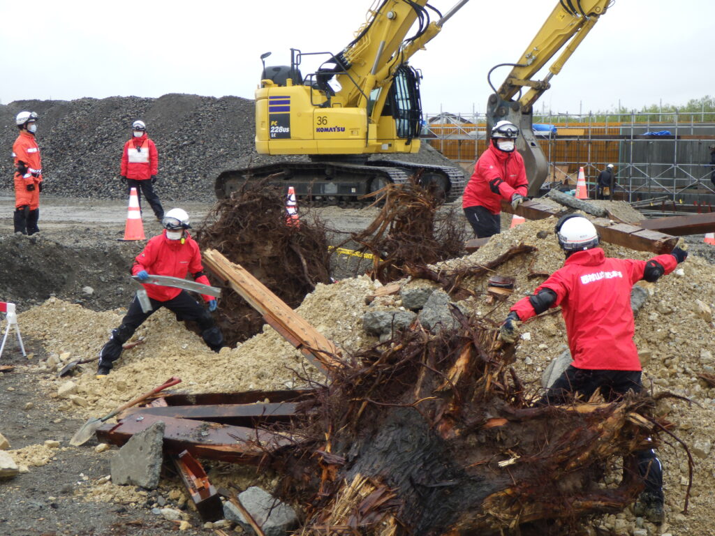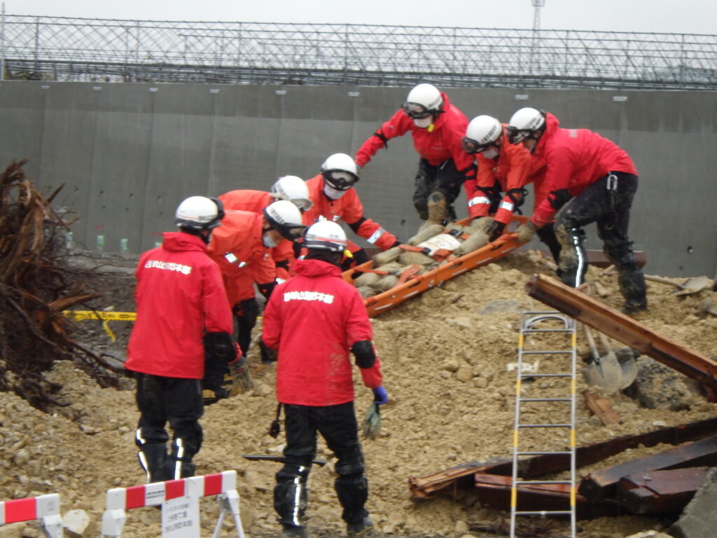訓練に参加した隊員の方々は、スコップや「ソンデ棒」と呼ばれる道具を使い、手作業で土砂やがれきを撤去し、人に見たてた人形を土砂の中から救出していました。
