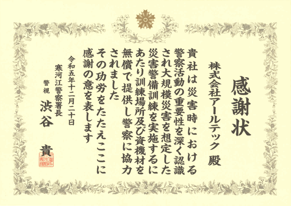 弊社の寒河江警察署の方々と連携した防災訓練を通じて、地域の皆様が安心して住み続けられるまちづくりへの活動が評価され、感謝状をいただきました。