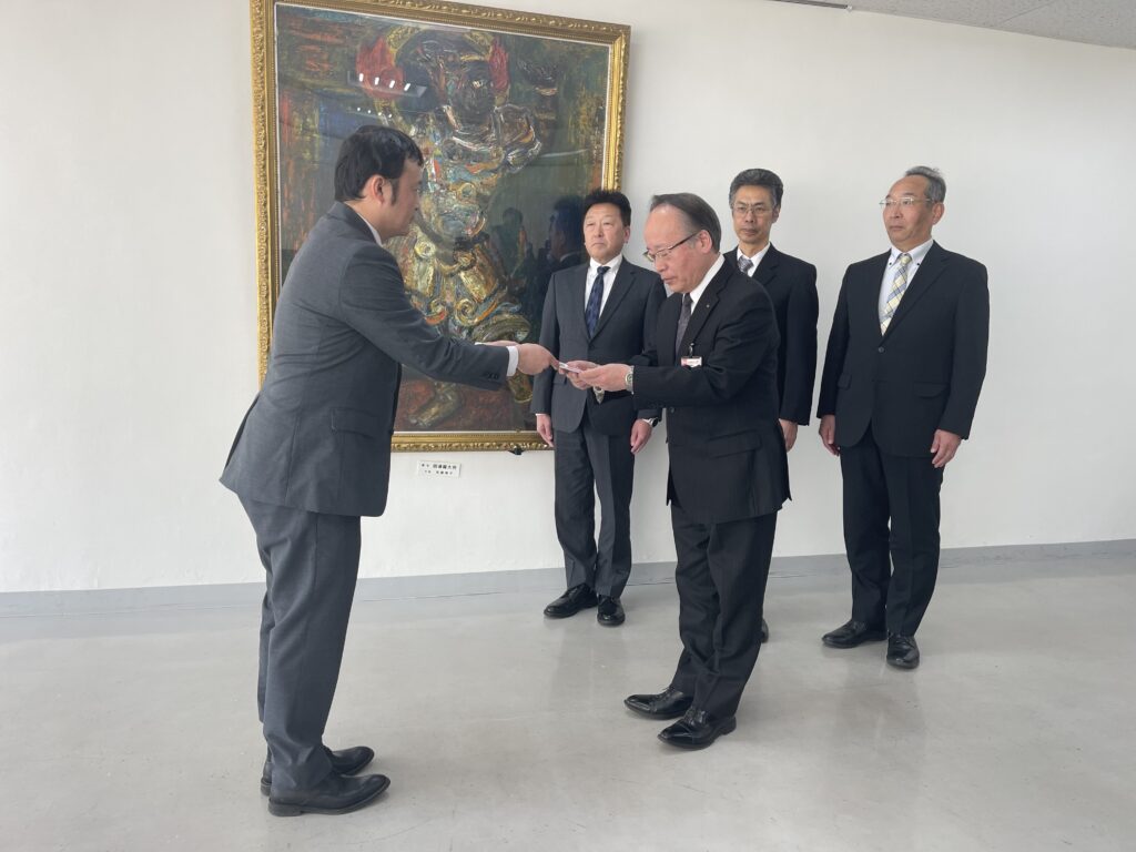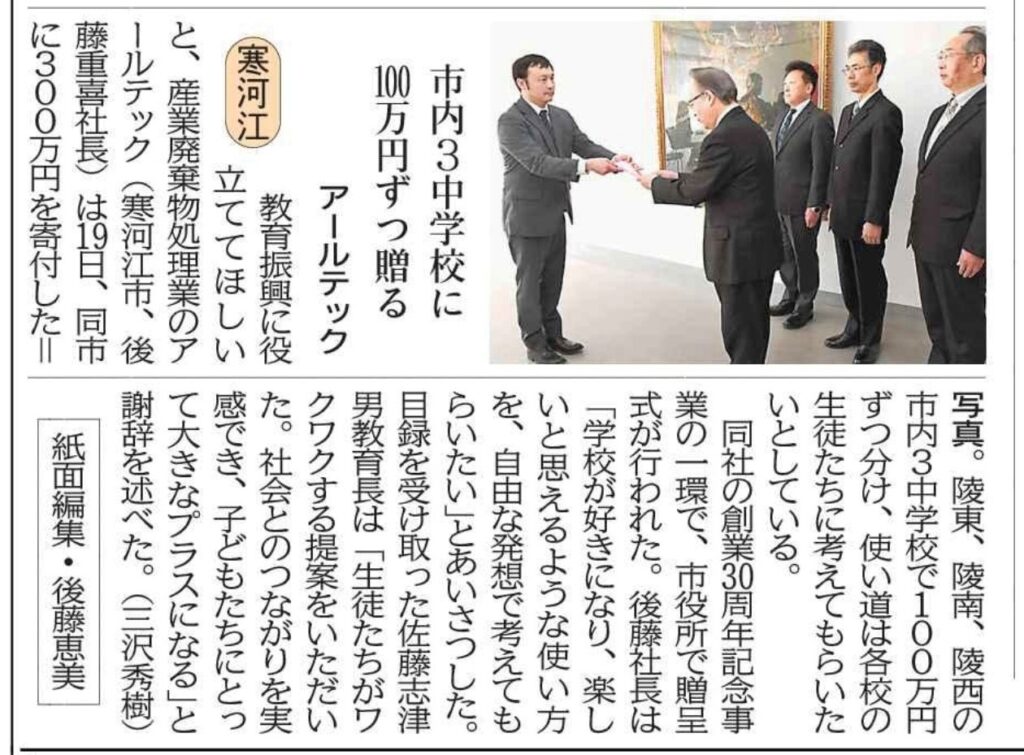 教育振興に役立てていただきたく、寒河江市に300万円を寄附させていただき、陵東中学校・陵南中学校・陵西中学校の市内3中学校へ100万円ずつ贈られました。