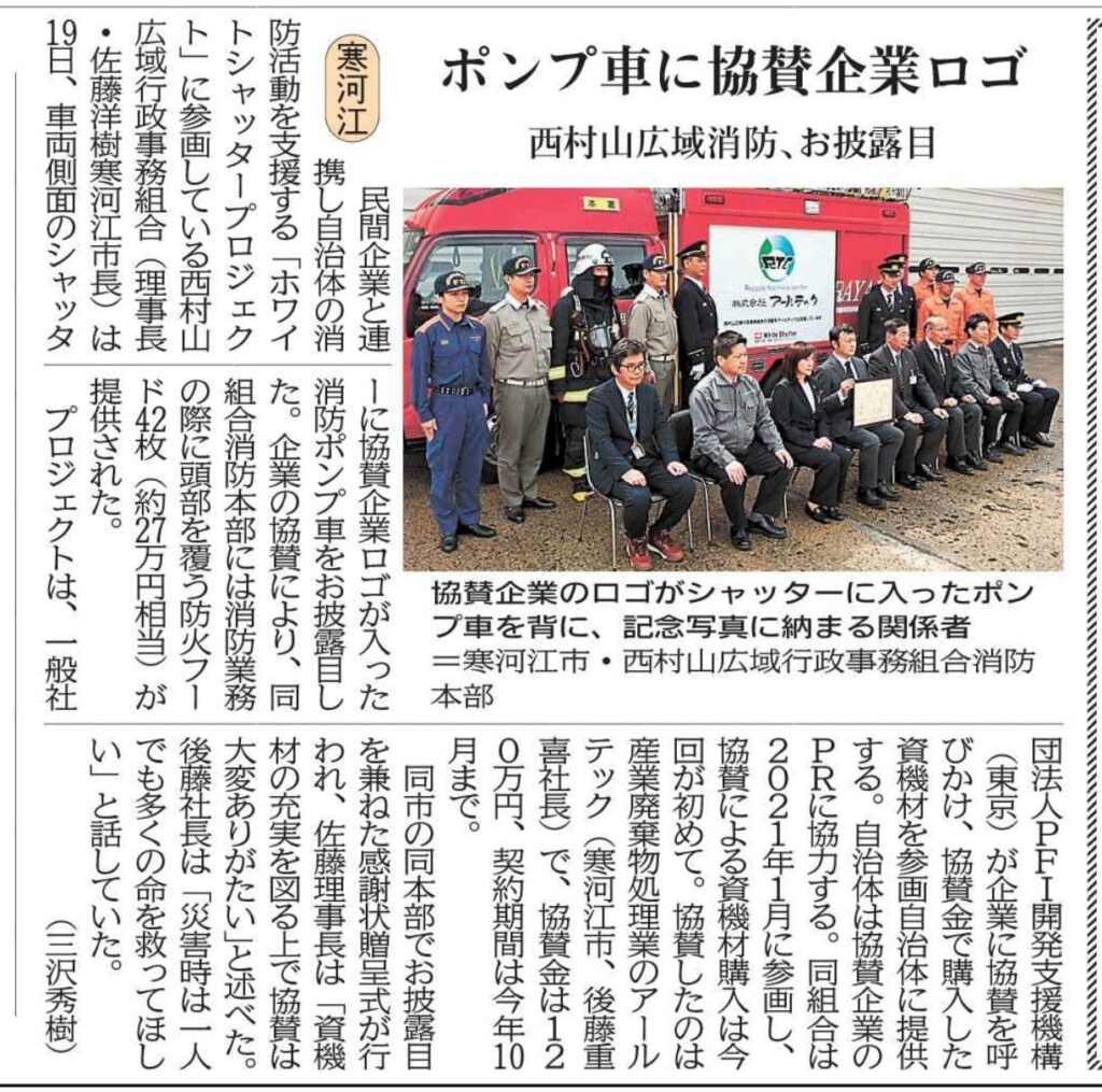 弊社は、令和5年10月より、民間企業による消防・救急・防災現場への支援プロジェクト「ホワイトシャッタープロジェクト」に参画しております。