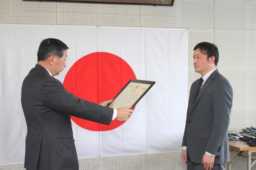 寒河江市の消防本部にて、車両側面のシャッターに弊社の企業ロゴが入った消防ポンプ車のお披露目を兼ねた感謝状贈呈式が行われました。