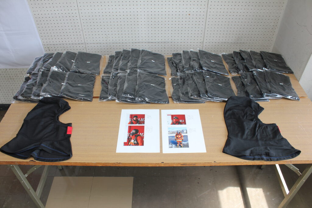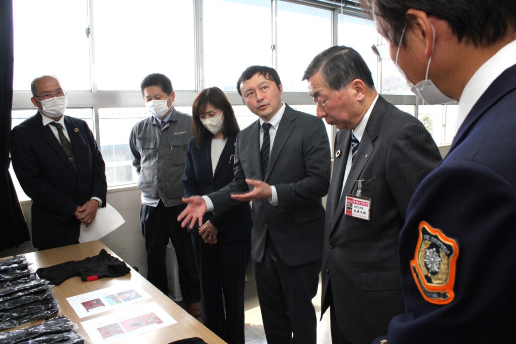西村山広域行政事務組合消防本部には、消防業務の際に頭部を覆う防火フード42枚が提供され、協賛による資機材購入は今回が初めてとの事でした。