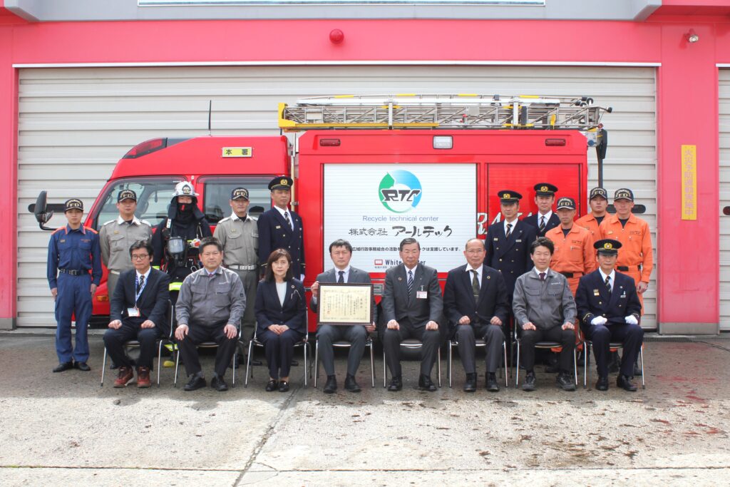 寒河江市の消防本部にて、車両側面のシャッターに弊社の企業ロゴが入った消防ポンプ車のお披露目を兼ねた感謝状贈呈式が行われました。