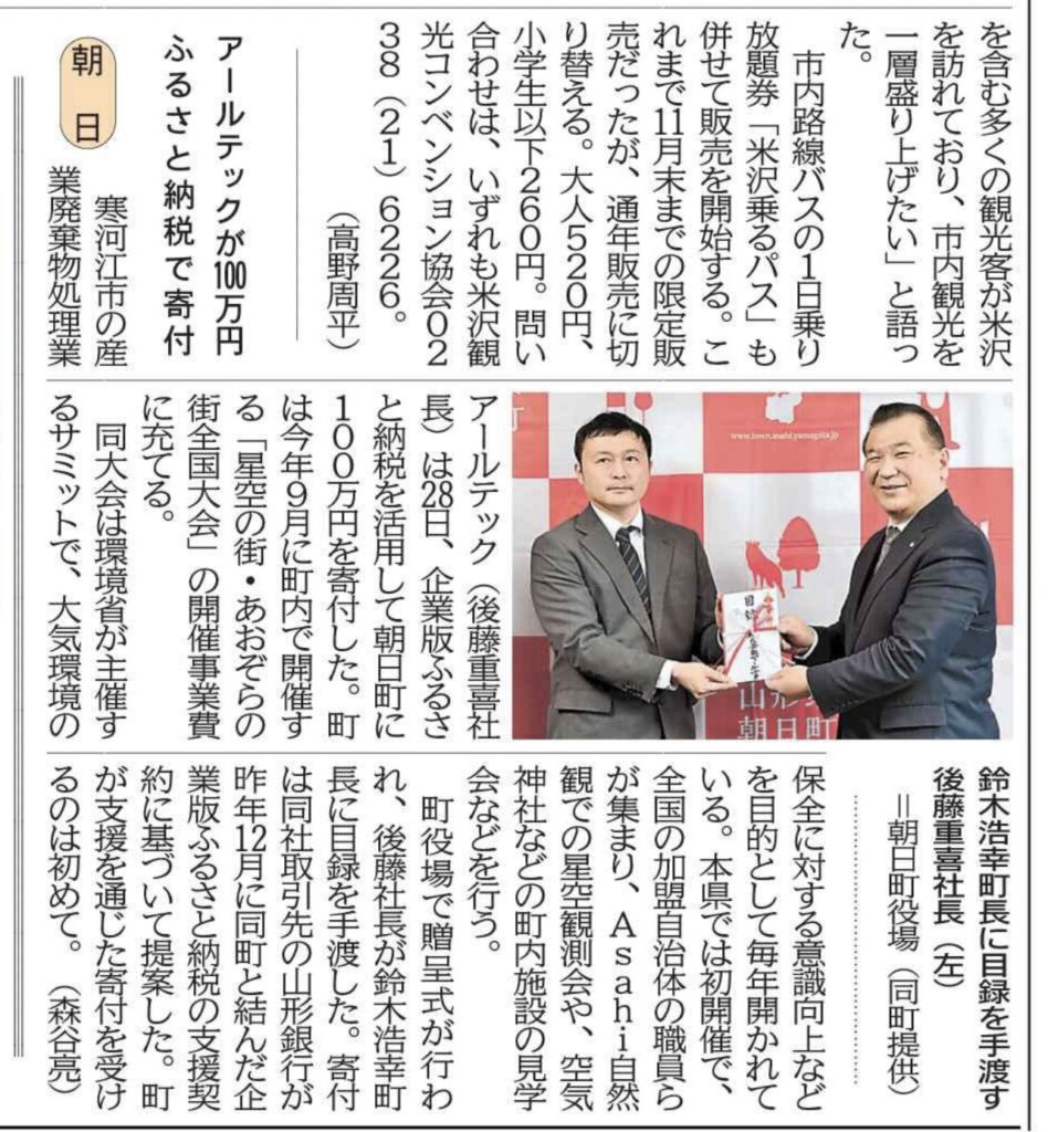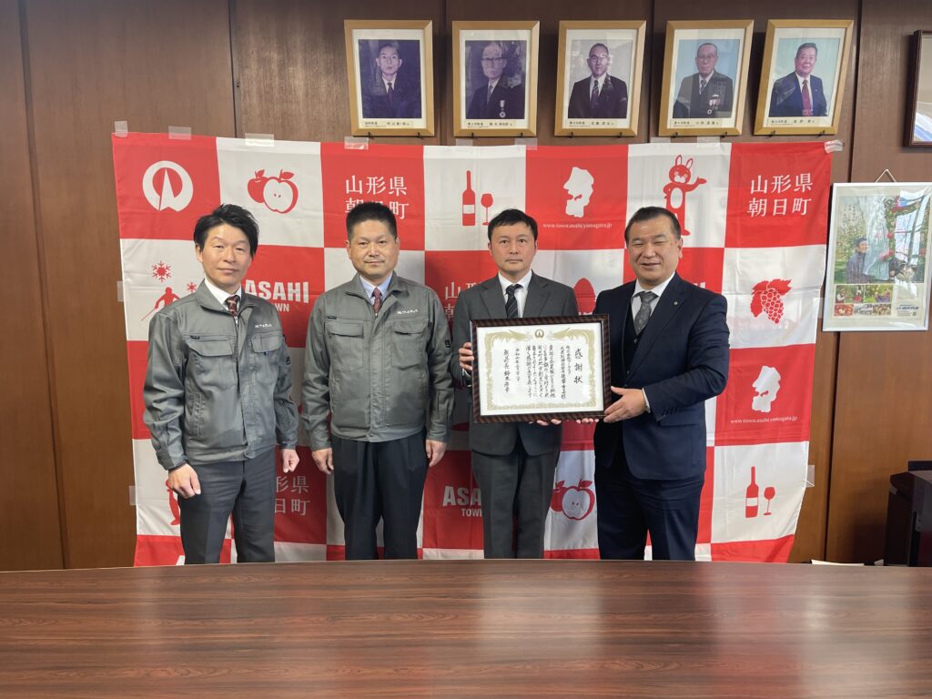 弊社は、企業版ふるさと納税を通じて朝日町へ100万円を寄附いたしました。