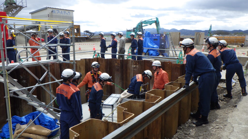 西村山広域行政事務組合消防本部と連携し、弊社敷地内にある深さ約10mの防火水槽を使用した酸欠事故の救助訓練及び、施設内の建物を使用し、狭い場所を想定したホース延長訓練が行われました。