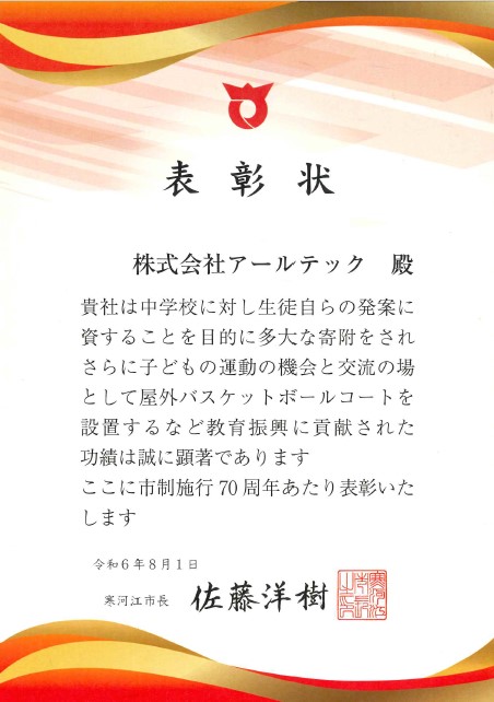 弊社の、寒河江市内中学校へ生徒自らの発案に資することを目的とした資金支援や、子どもの運動の機会と交流の場として屋外バスケットボールコートの設置など、未来を担う子どもたちへの教育振興を評価いただきました。