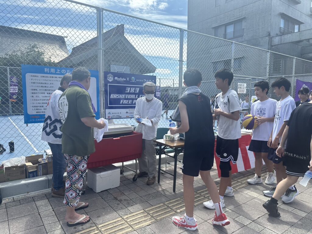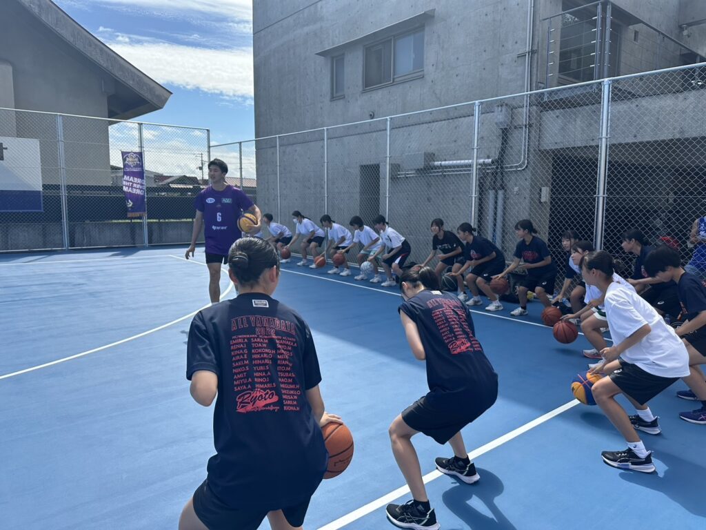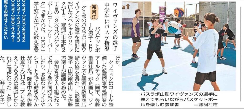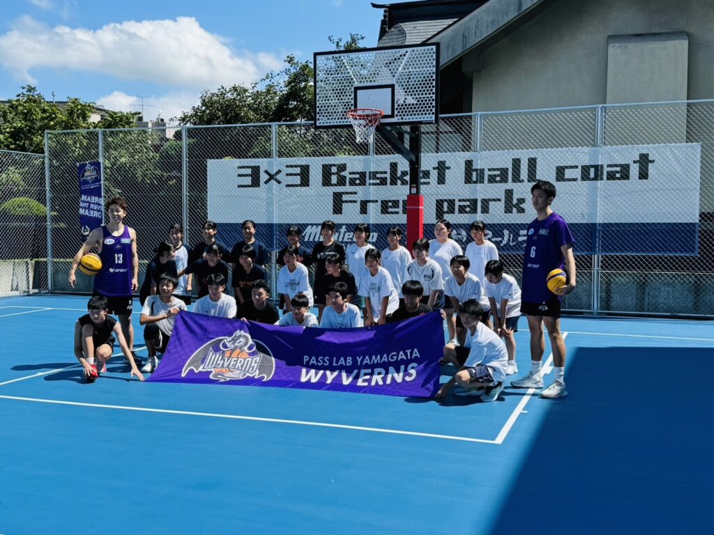 6月に寒河江駅前にOPENしました「3×3basketball court free park」にて山形ワイヴァンズ様選手2名を講師にお招きし、駅前商店街の協力のもとバスケットボールクリニックを開催いたしました。