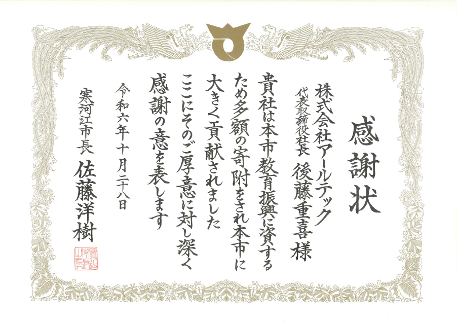 令和6年度に教育振興の一環で、寒河江市内の3中学校へ寄付をした「中学生チャレンジ応援事業補助金事業」が評価され、寒河江市長より感謝状を頂きました。