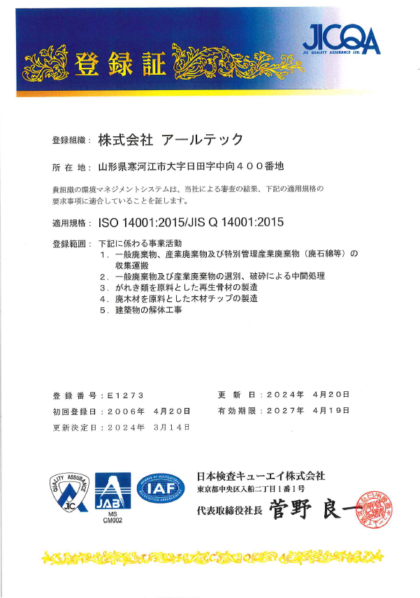 「ISO14001」の認証を2006年4月20日に取得しております。
