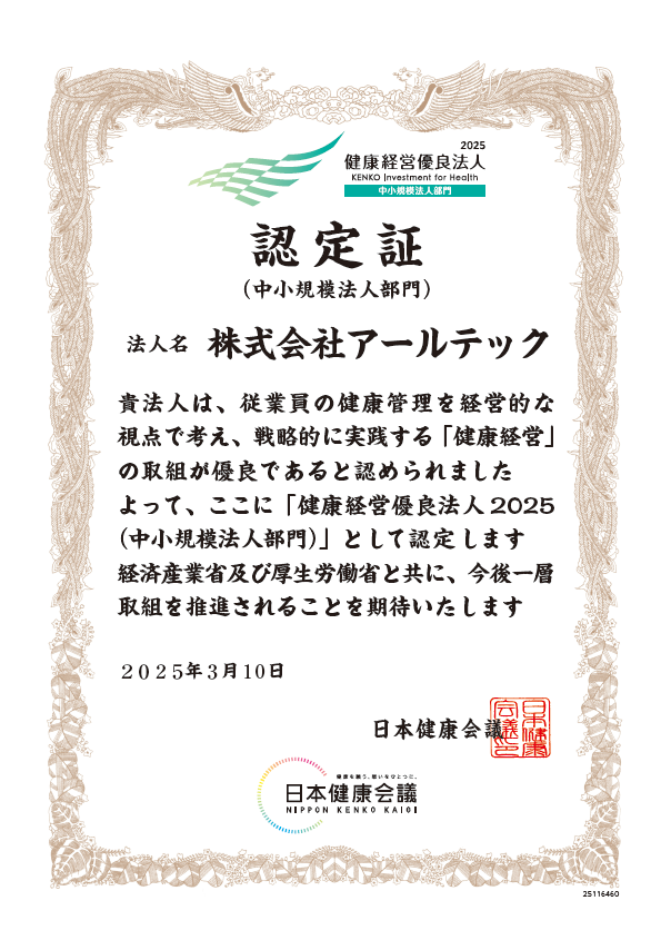 弊社は、優良な健康経営を実施している法人として経営産業省・日本健康会議が共同で実施する「健康経営優良法人2025(中小規模法人部門)」に認定されました。