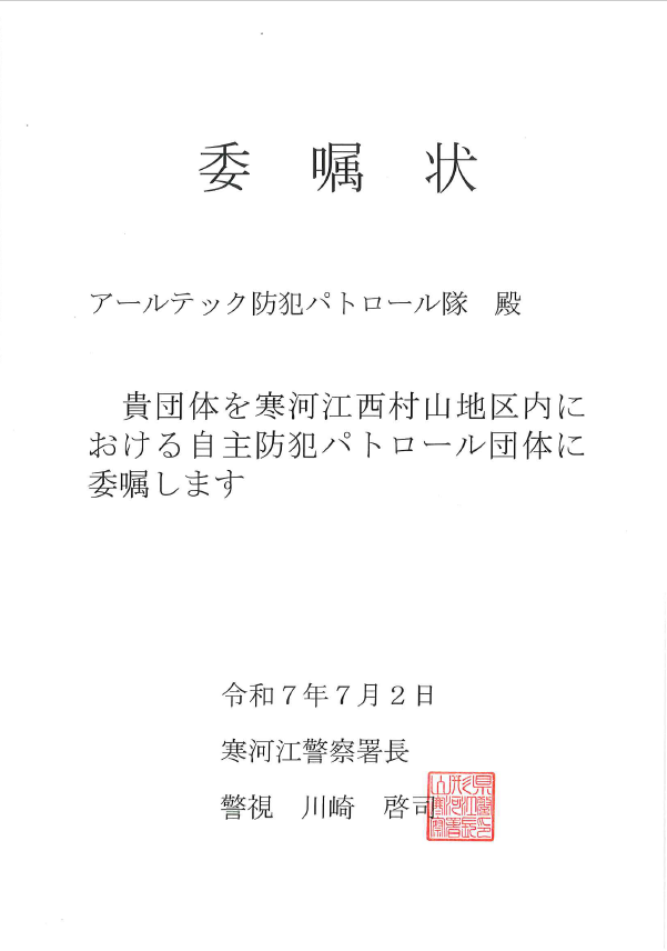 寒河江西村山地区内における自主防犯パトロール団体へ委嘱致しました。
