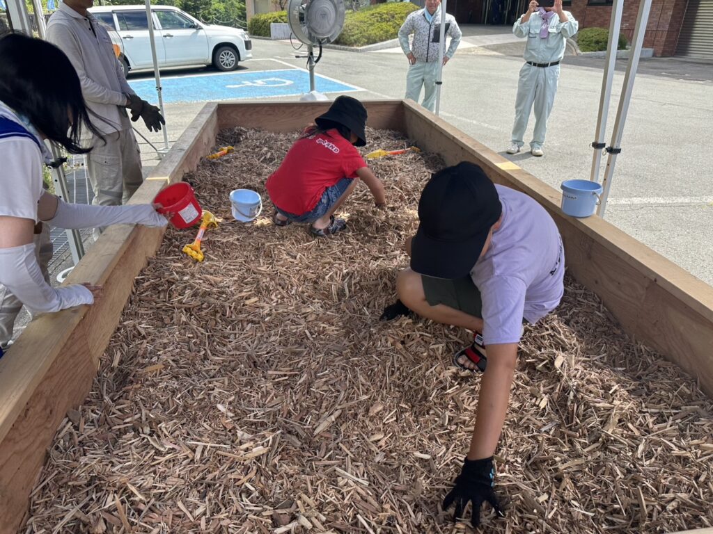 イベントブースでは、寒河江ダムに流れ着いた流木を当社で製品化した木チップを使用し、「木チップの中から宝探し!」を行いました。