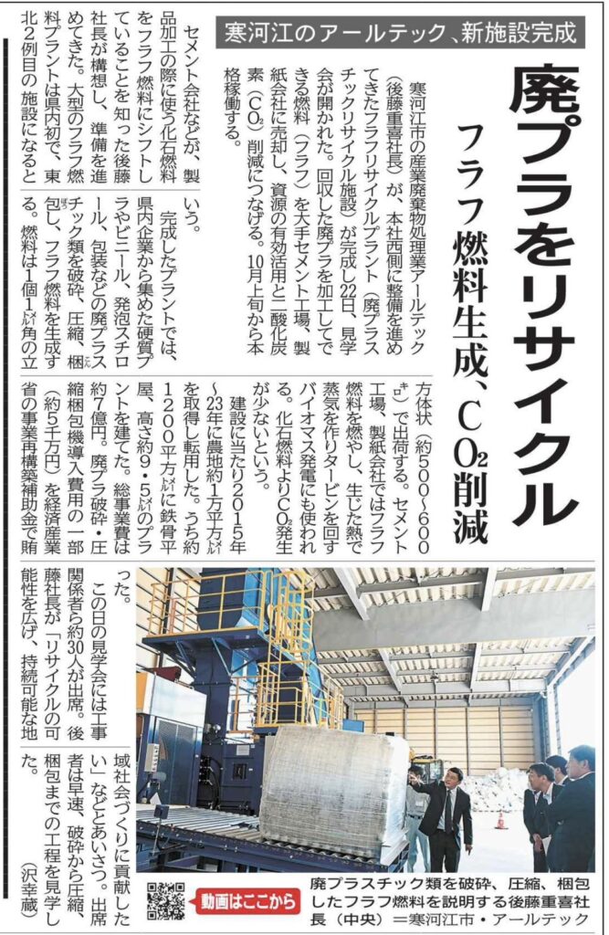 弊社本社西側に、整備を進めてまいりました「フラフリサイクルプラント(廃プラスチックリサイクル施設)が完成し、見学会を執り行いました。