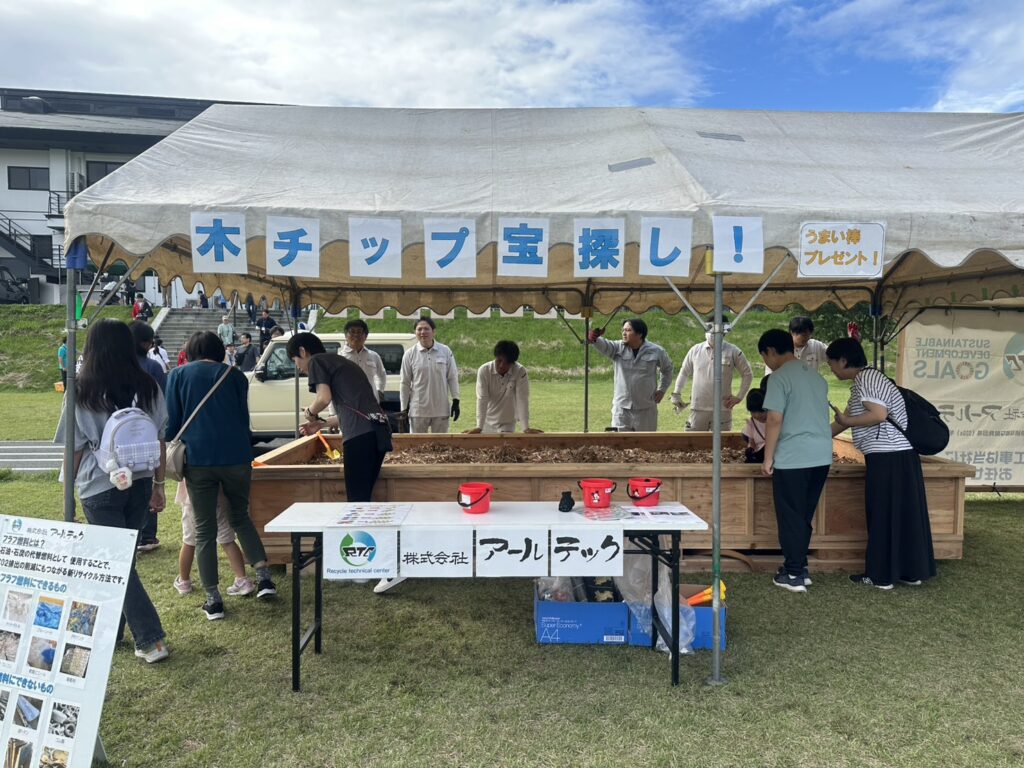 弊社ブースでは、豪雨災害により寒河江ダムに流れ着いた流木などを自社リサイクルプラントにてリサイクルを行った木チップを使用し、「木チップの中から宝探し!」を行いました。